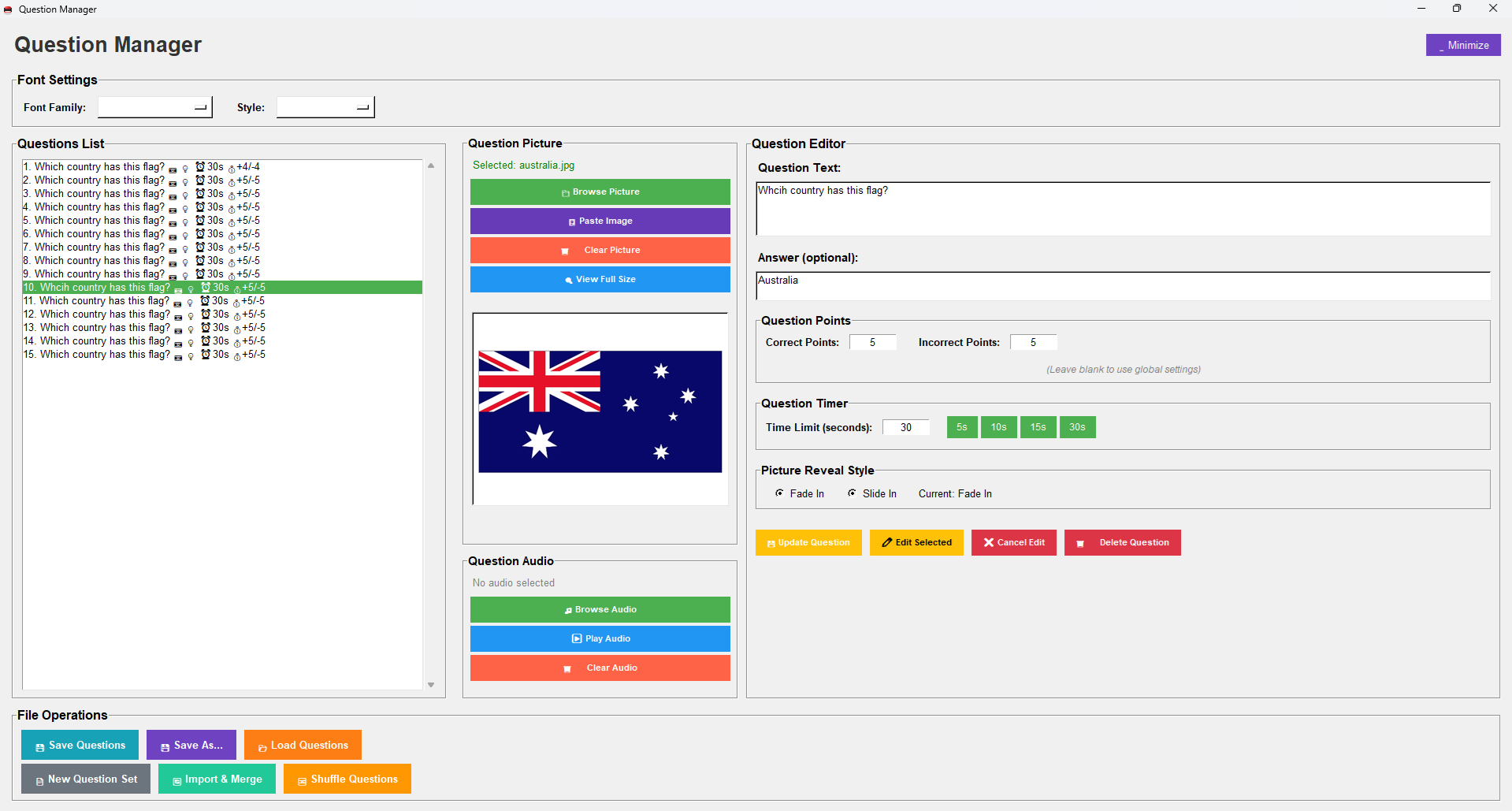 Question Manager: Create and manage custom quiz questions with support for pictures, timers, points, and reveal styles (fade-in or slide-in) for professional presentations.